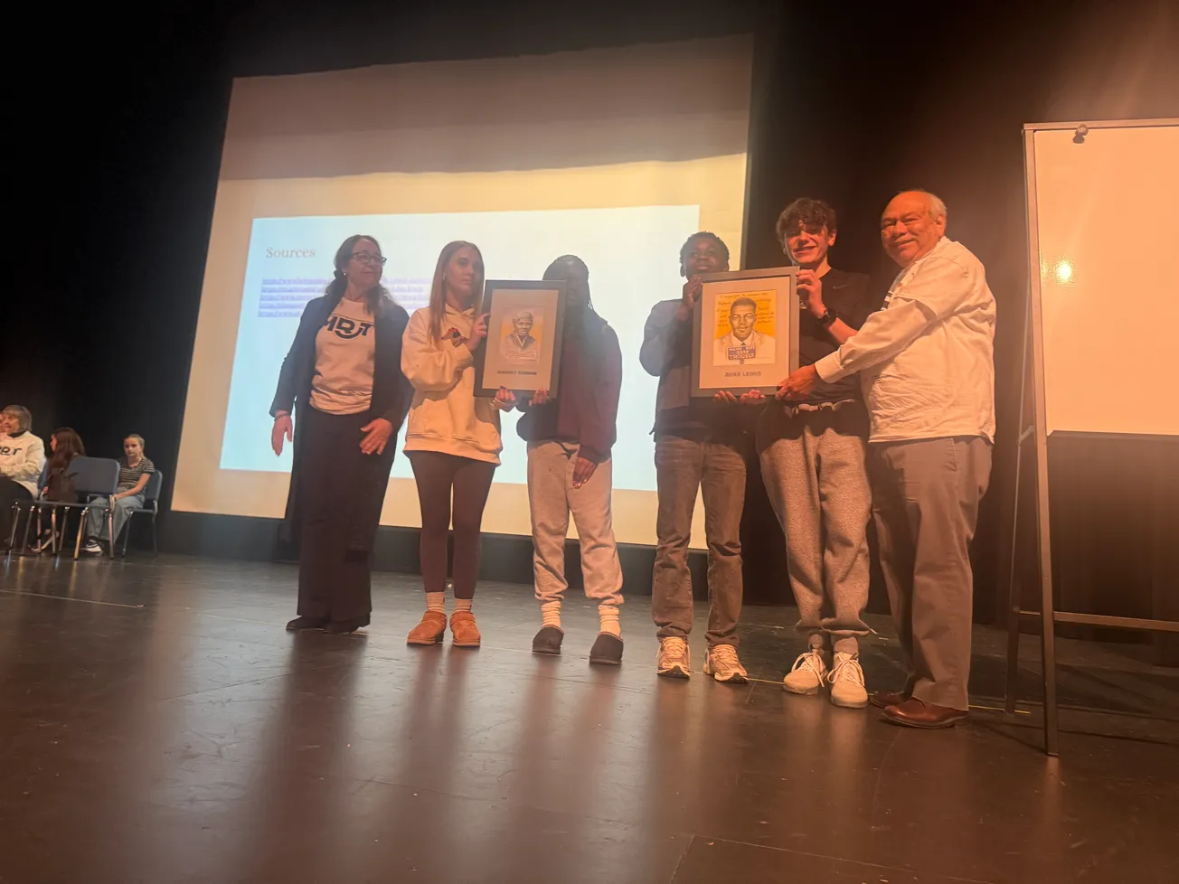 During a question-and-answer session with eighth graders and MRJT members, a student asked who created the paintings. Susan Morrison of the MRJT explained that Demeter, who lives in Danvers, was inspired by both figures and initially gave the portraits as a gift to Morrison and her partner Jay.