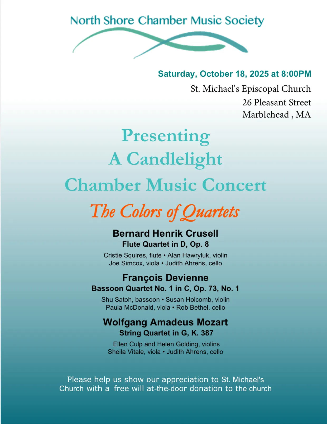 A candlelight chamber music concert titled “The Colors of Quartets” will be held at 8 p.m. Oct. 18 at St. Michael’s Episcopal Church, 26 Pleasant St.
