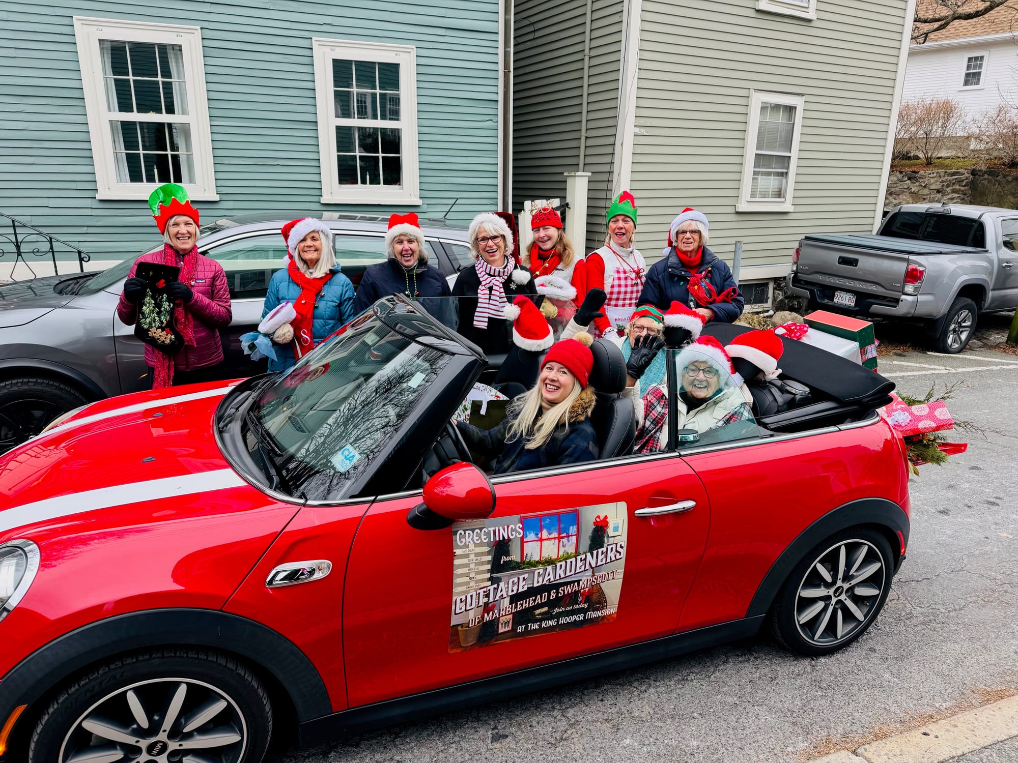 The garden elves looked like they were having a blast. Rosemary O’Neil Crosby brought her top elf game to the parade. The two Cottage Gardeners who were having the most fun were Charlene Tyler and Betty Spellios in the back of my red Mini convertible.
