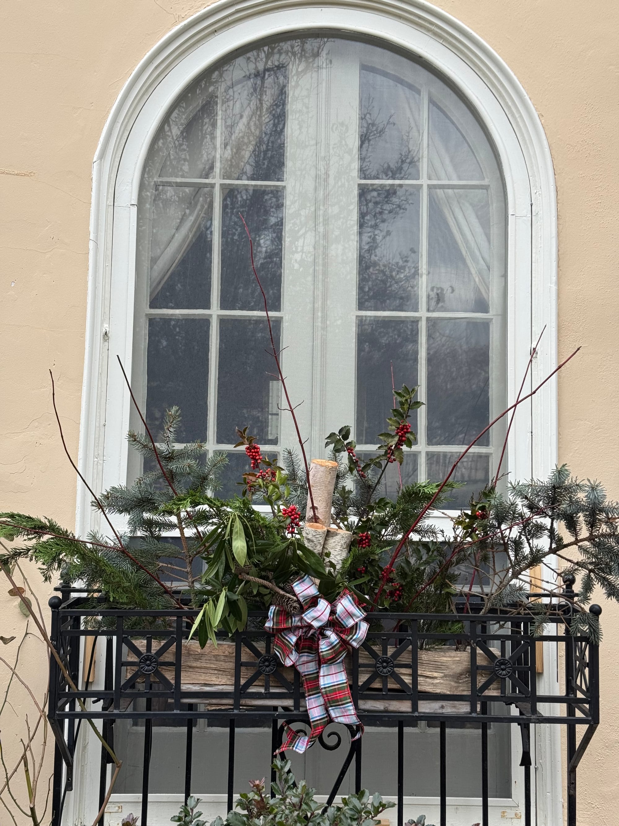 Finally, one last pointer: I had my husband drill holes into logs and placed them in my window box ironwork. I stick all my greens in the holes. It is not perfect but allows me to reuse the actual plastic window boxes for spring bulbs.