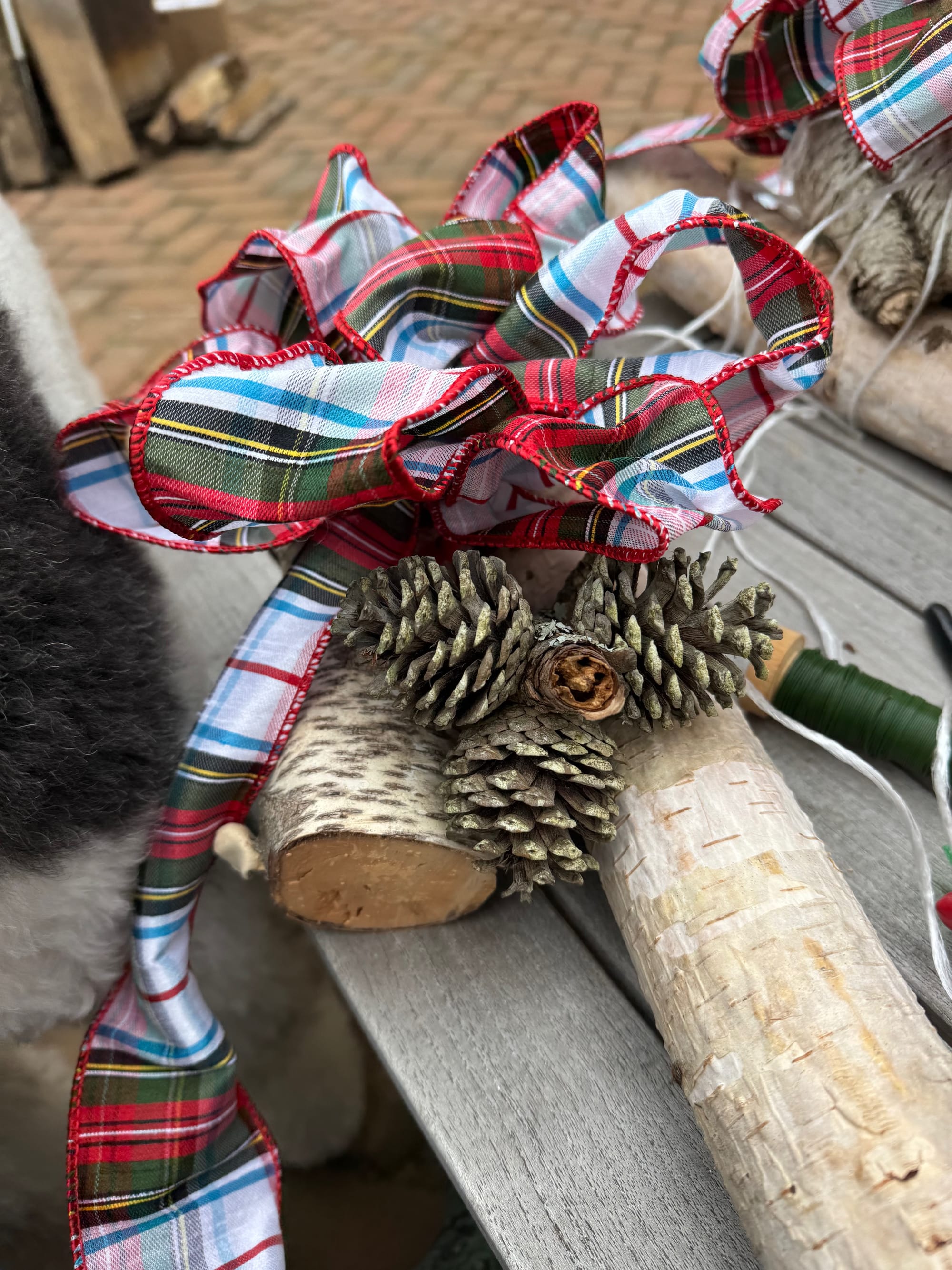 A few narrow branches from a birch tree are a favorite, too. In the center, toward the front, I usually add a bright bow to add some pop of color. Every year I change it out and get more and more creative.