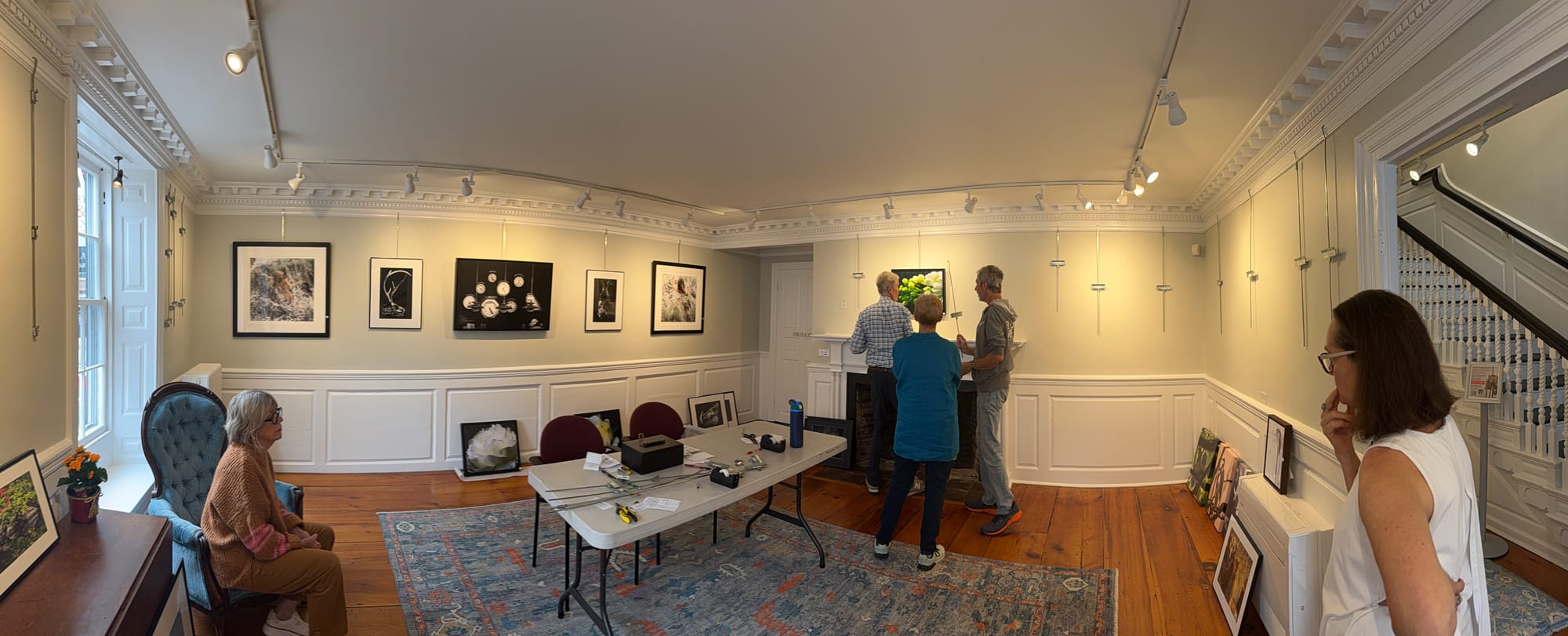 The King Hooper Mansion’s seven separate galleries provide distinct spaces for each exhibition while maintaining connections between shows. Additional wall space in stairways and hallways accommodates the large number of works.