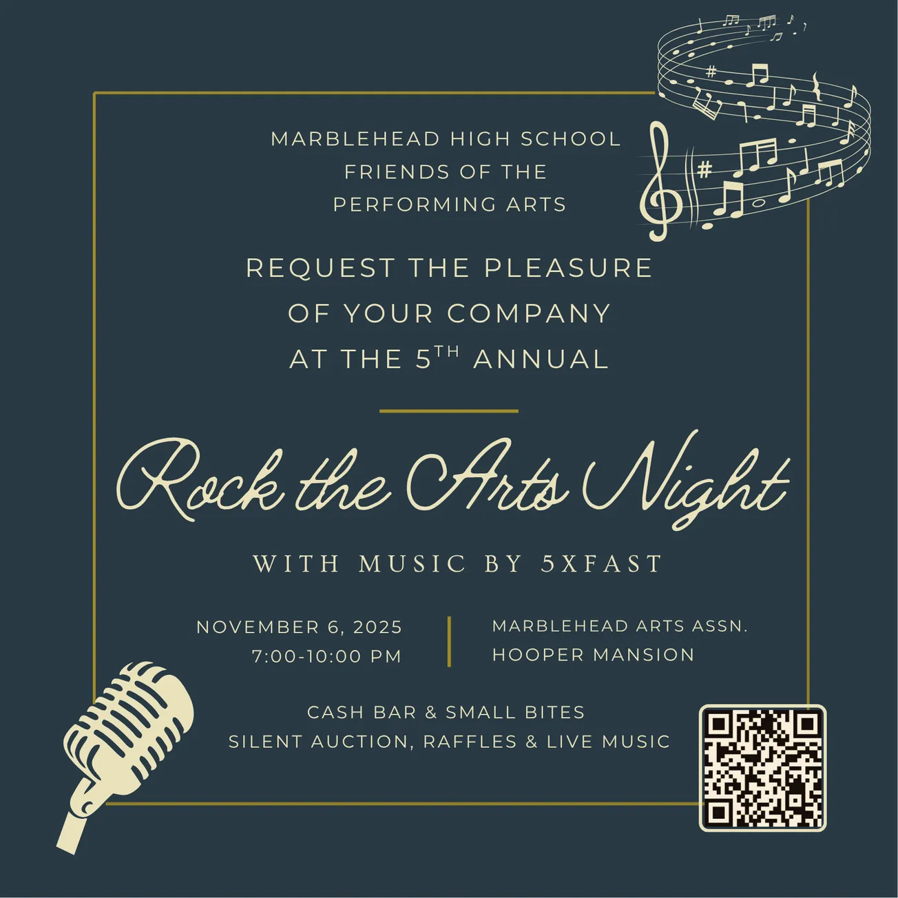 The event will feature live music by 5X Fast, small bites, a cash bar, raffles and a silent auction. Proceeds will support Marblehead High School’s performing arts programs, including instrument upgrades, costume and set design, student scholarships and enrichment opportunities.