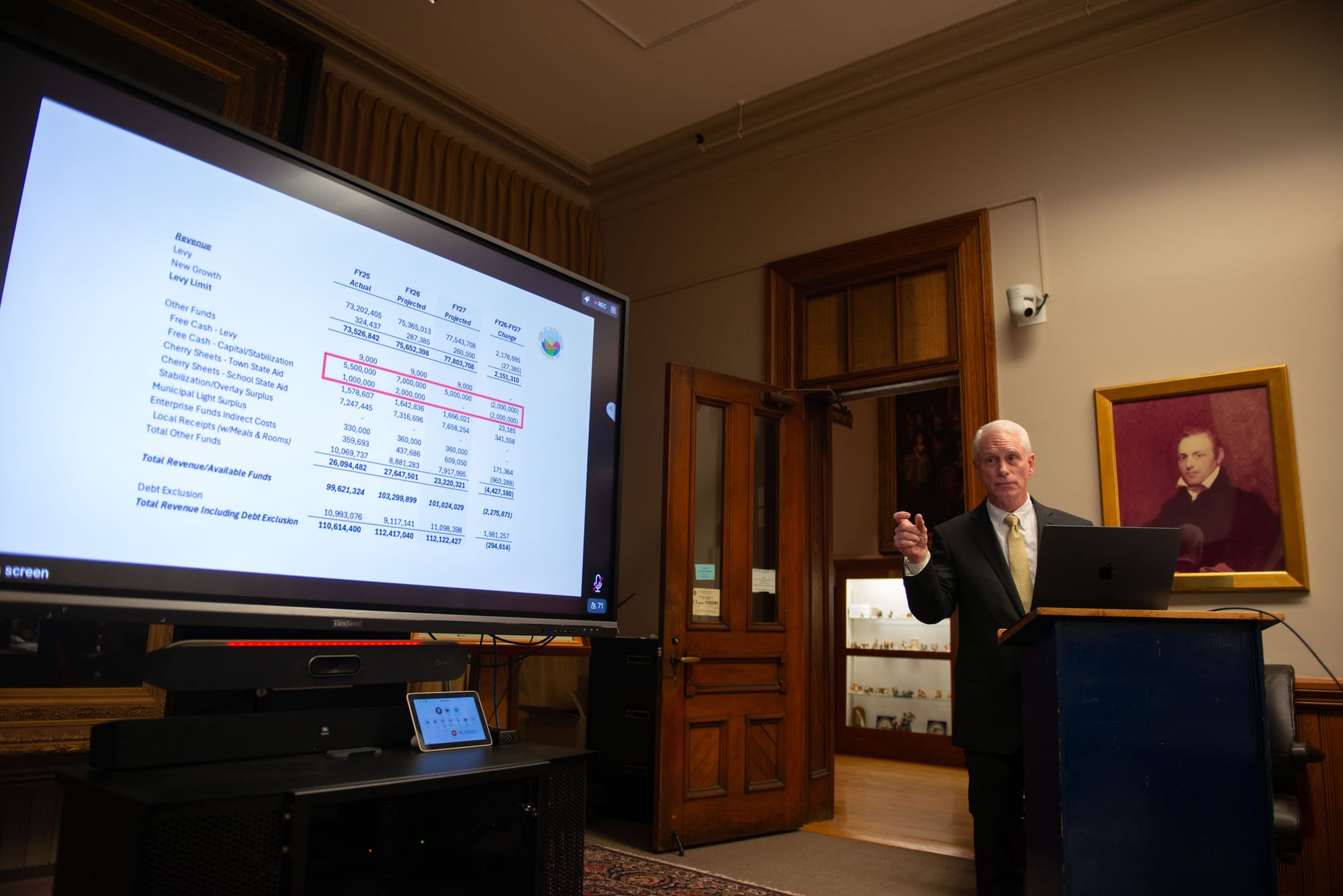 Those gains are offset by reductions elsewhere. The town is budgeting $2 million less from free cash to support the operating levy, dropping from $7 million to $5 million. Another $2 million previously allocated from free cash for capital and stabilization purposes is eliminated entirely. Local receipts from sources such as interest income, motor vehicle excise taxes and permits are projected to decline by $963,288.
