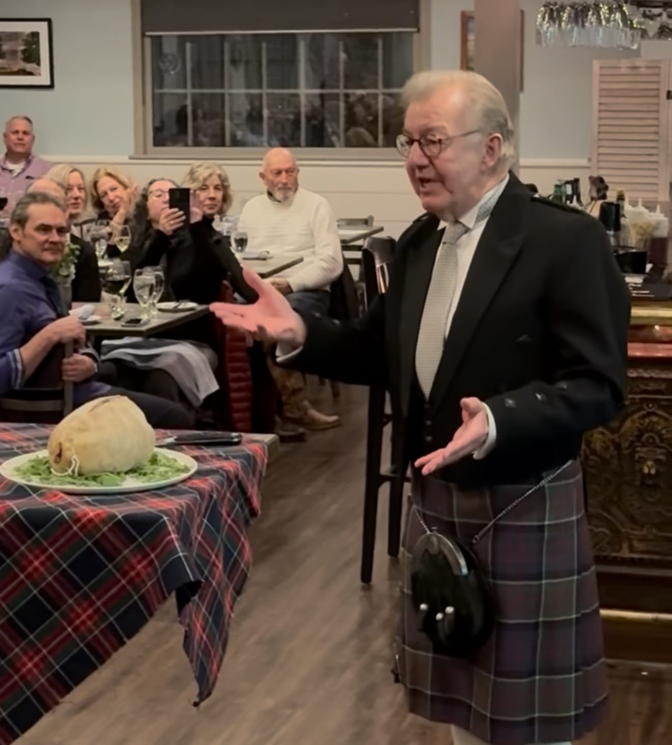 The Marblehead Burns Night is once again being organized by Rhod Sharp and his wife, Vicki Staveacre, who introduced Burns Suppers at Old North Church. For three years from 2018, they took over Marblehead Little Theatre for the original and highly successful “Love Scotland” shows. After COVID-19, Sharp teamed up with his original Burns Supper collaborators, Jeremy Bell and Julianne Gearhart, for a traditional Burns Night celebration with the enthusiastic help of Robert Simonelli and the staff of The Landing.