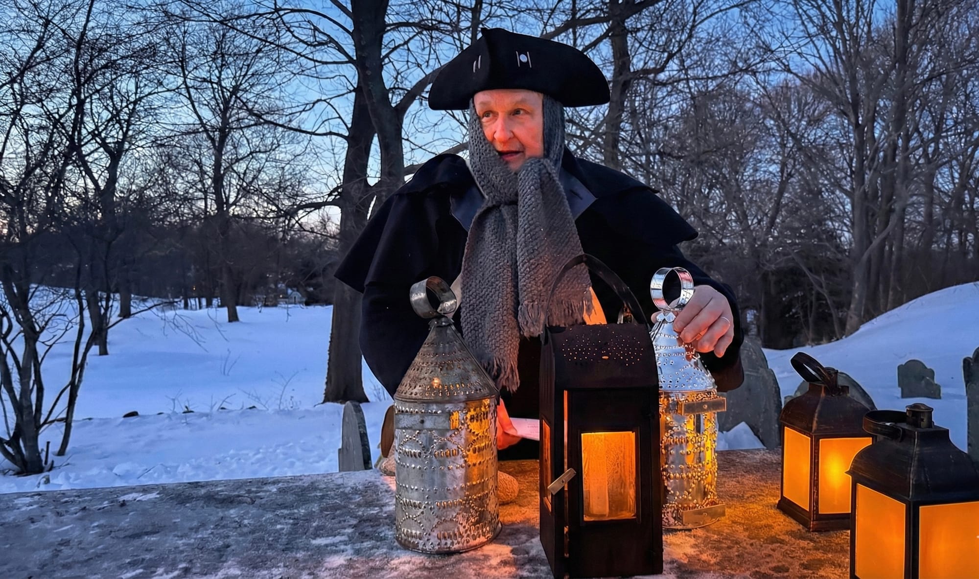 Snowbanked paths and frozen headstones framed a lantern-lit gathering Saturday evening as residents and reenactors climbed Old Burial Hill in 15-degree weather to mark the 229th anniversary of the death of Gen. John Glover, one of the town's most consequential Revolutionary War figures.