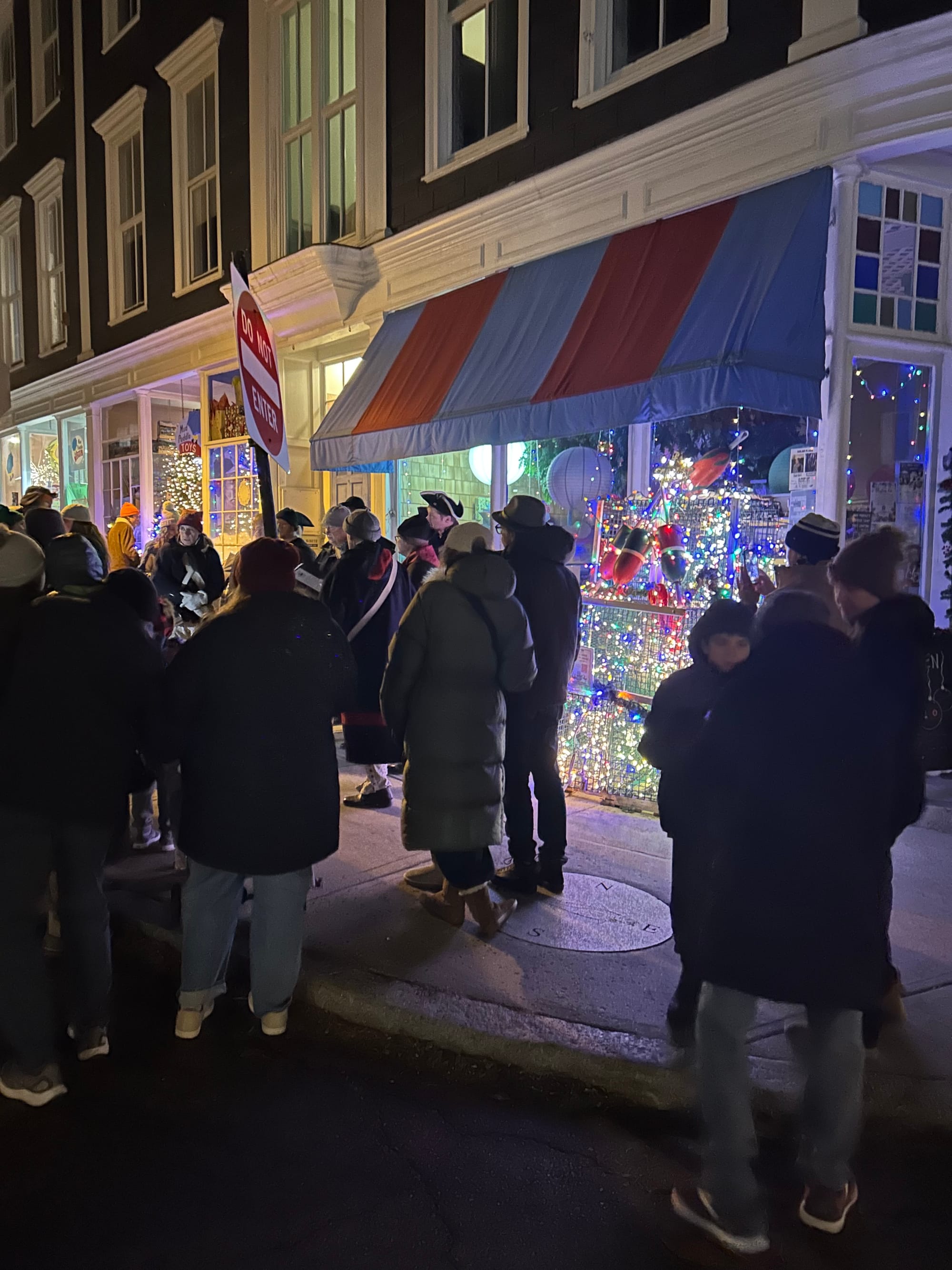 The weekend opened with back-to-back tree lightings. At National Grand Bank, families packed the Essex Street lot as the official tree came on around 7 p.m. A block away, Mud Puddle Toys drew roughly 80 people for the lighting of its lobster-trap tree — a local favorite built each year from eight borrowed traps lent by Little Harbor Lobster Company and decorated with lights and garland. The display has become a reliable photo stop and a draw for foot traffic on a typically quiet winter retail stretch.
