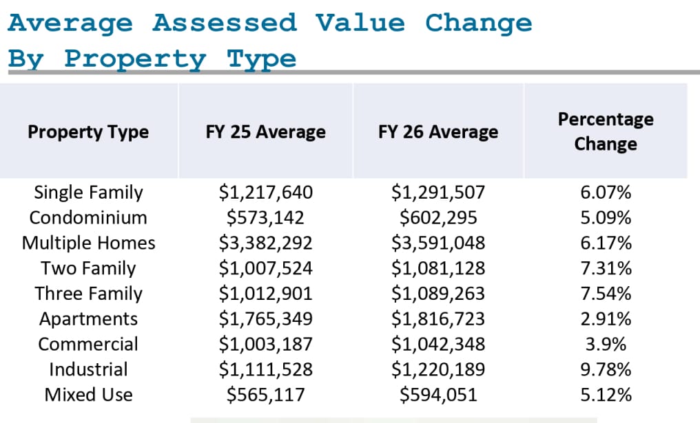 Other property types will see mixed effects based on median values. Condominium assessments rose from a median of $545,000 to $570,000, a 4.59 percent increase. Two-family homes climbed from $975,000 to $1,050,000, up 7.69 percent. Three-family properties increased from $995,000 to $1,075,000, an 8.04 percent rise.
