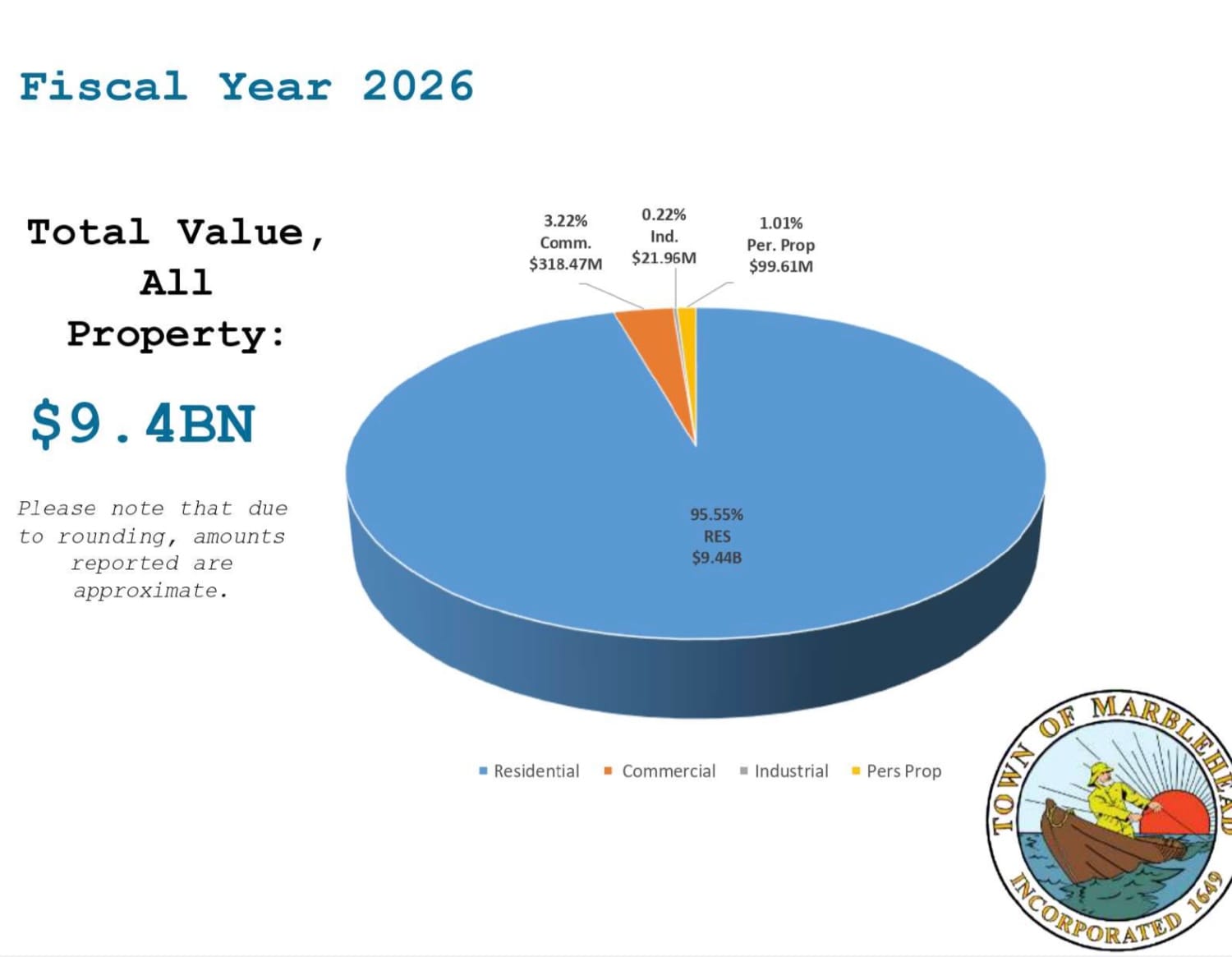 For fiscal 2026, the total assessed value of property in Marblehead rose about 6 percent, from roughly $9.32 billion to $9.89 billion, driven by continued home-price growth. Residential property makes up about 95 percent of that total, with commercial, industrial and personal property accounting for the rest.
