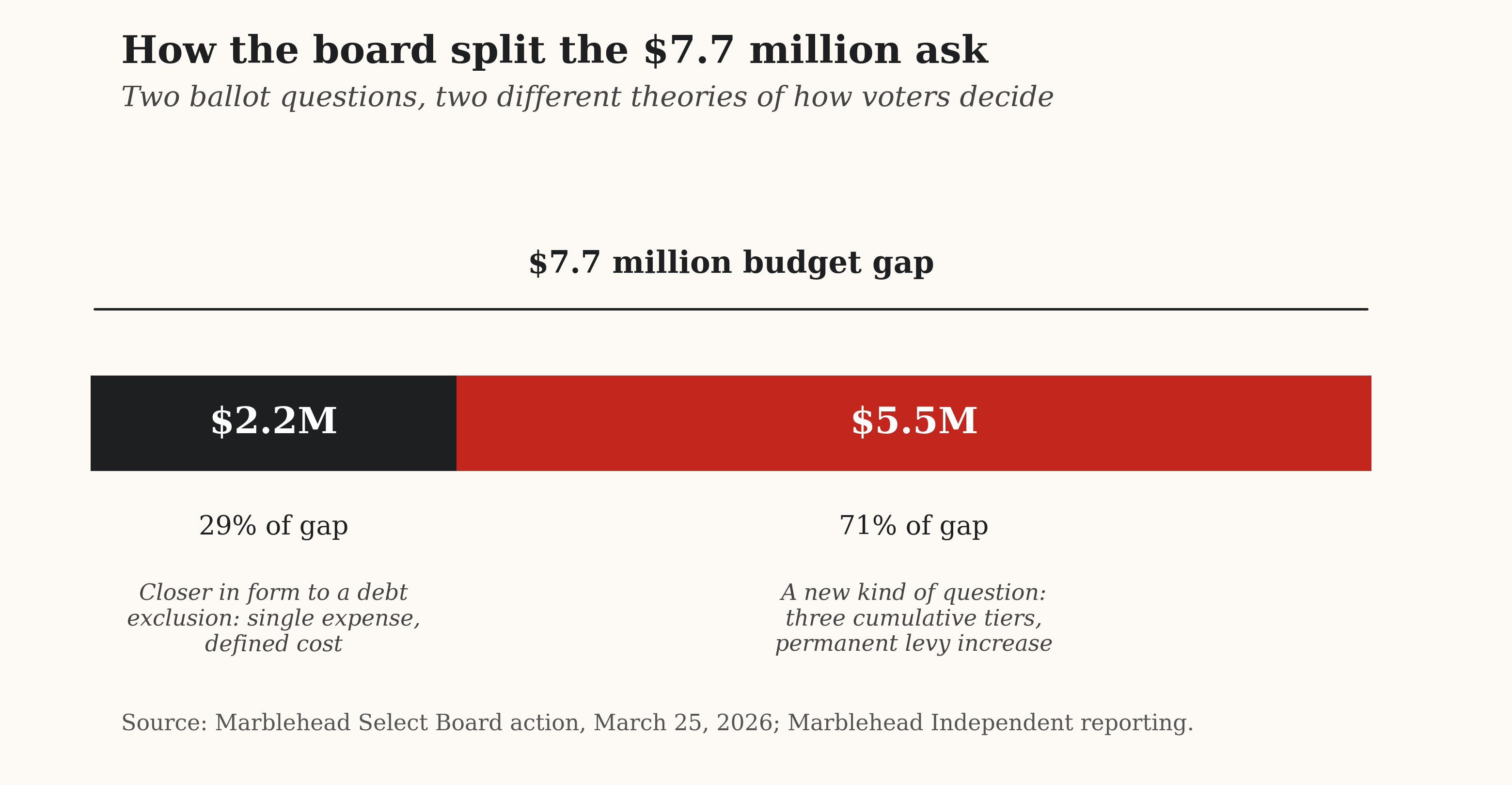 One theory says voters want a bundled, labeled choice with layers of ambition. The other says they want a single, specific, standalone question tied to a single, specific expense. If Town Meeting approves them, both will appear on the same ballot. Both will be decided by the same electorate on the same night. And together, they will determine whether the town closes a $7.7 million budget gap.