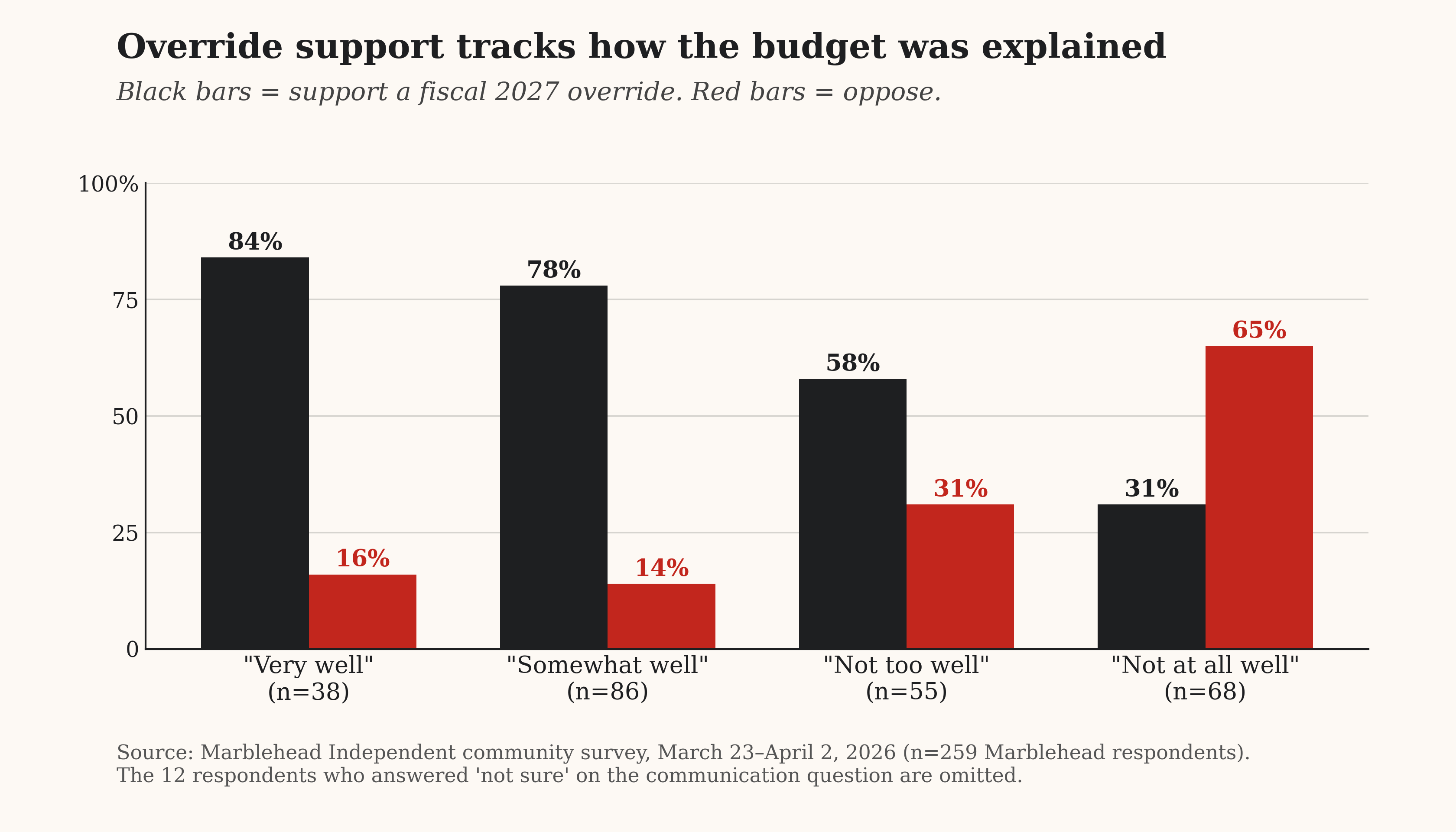 The Marblehead Independent’s community-sentiment survey, conducted between March 23 and April 2, suggests the distinction will matter. Sixty-one percent of the 259 respondents say they support an override. But only 34 percent picked “mostly new revenue” as their preferred approach. Thirty-five percent picked “a mix of both.” Twenty-five percent picked “mostly spending cuts.” The 91 hybrid-approach respondents — the largest bloc — lean yes by nearly four to one, but their preferred solution includes spending discipline.