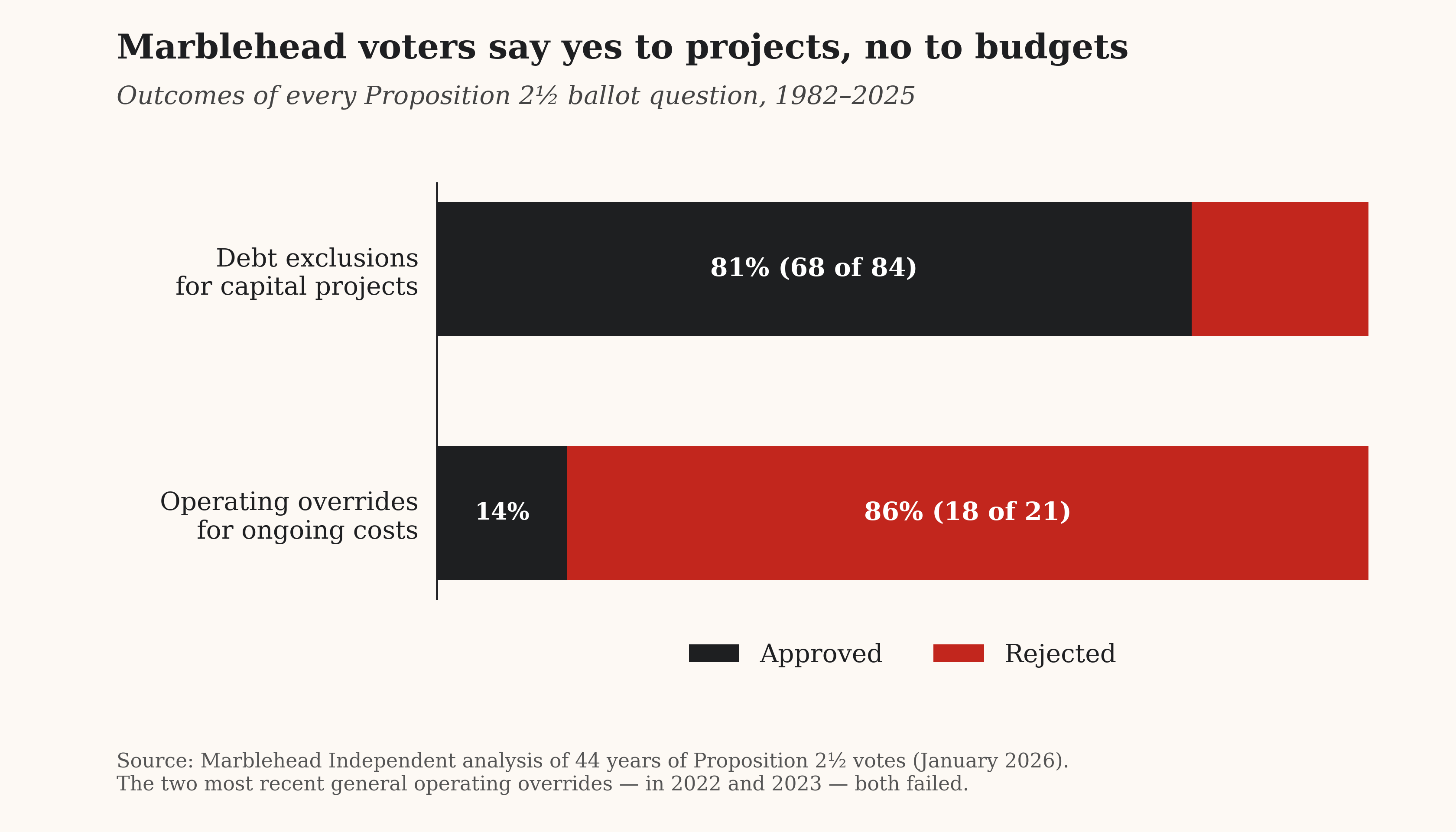 A Marblehead Independent analysis published in January found that since 1982, voters have approved 68 of 84 debt exclusions for capital projects, an 81 percent success rate, while approving just three of 21 operating overrides, an 86 percent failure rate. The town has not approved a permanent general operating budget increase since June 15, 2005. Select Board member Moses Grader, the former Finance Committee chair, described the reason for the split in a January interview: “Debt overrides are transparent, specific and directly accountable. Operating budgets are generally not as clear. Too many discretionary components. Less accountability around why increases are happening.”