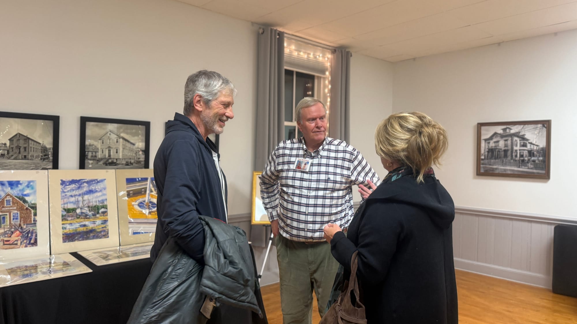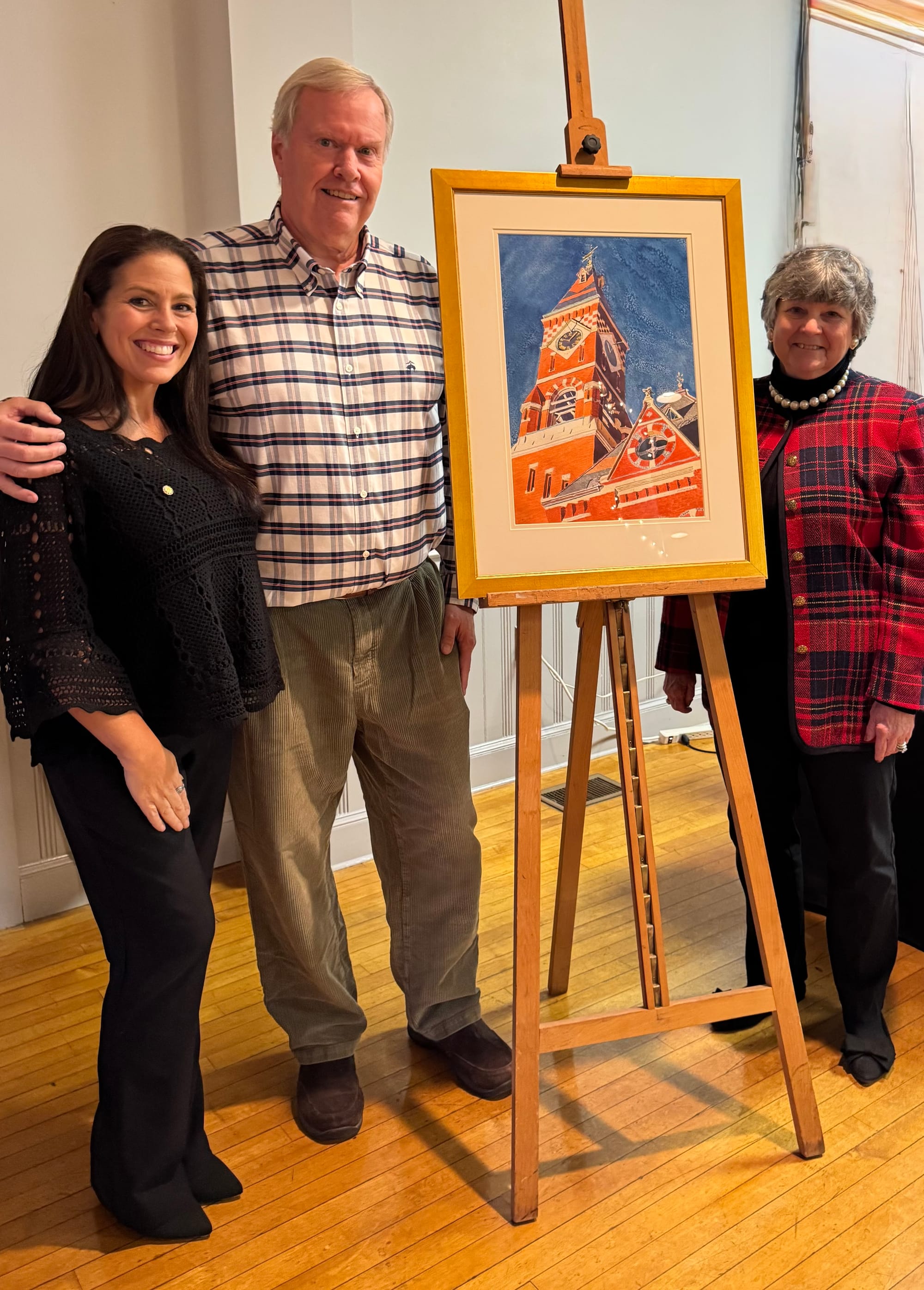 Artist Paul McMahan stood before about 100 people gathered at the Masonic Lodge as the covering came off his latest watercolor, revealing Abbot Hall bathed in nighttime spotlights with its clock frozen at 10:10 p.m.