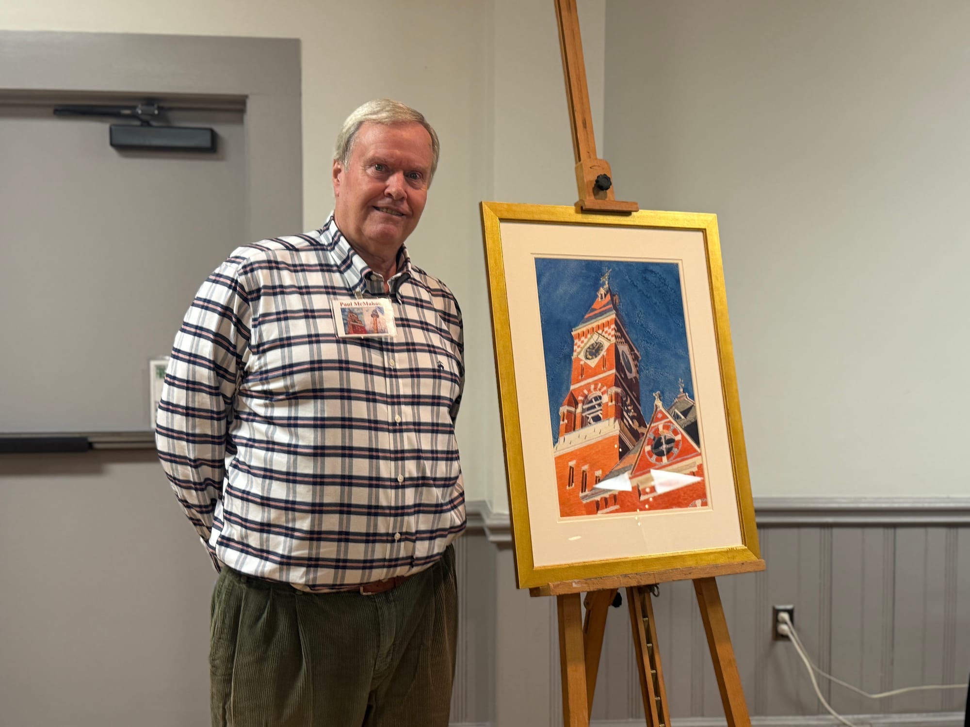 Gene Arnould, a fellow Rotarian who provided framing for the artwork, introduced McMahan by highlighting his decades-long career as an architectural illustrator and educator. Arnould noted McMahan has taught at the college level for more than 30 years and worked on prestigious projects including the pyramid at the Louvre Museum in Paris.
