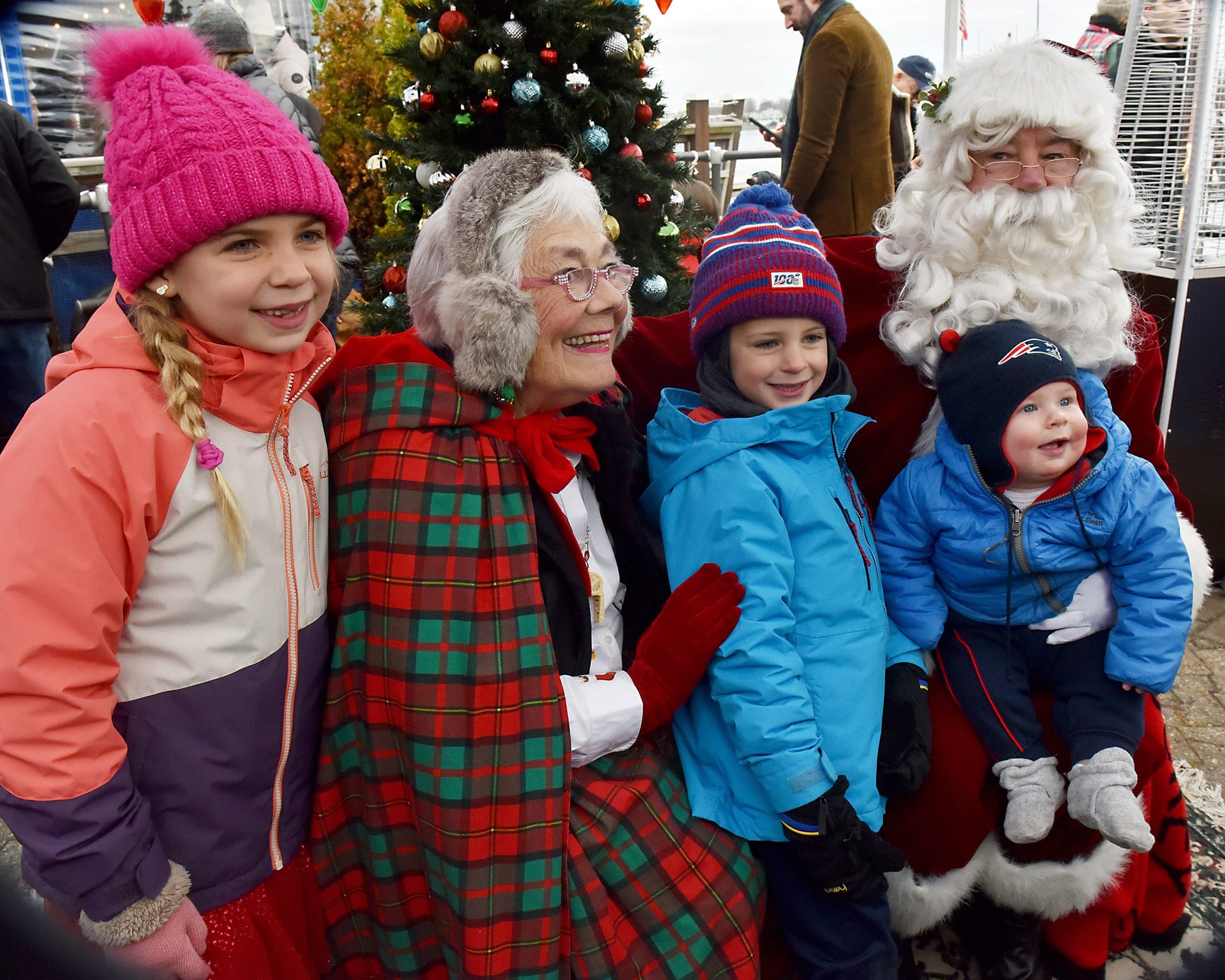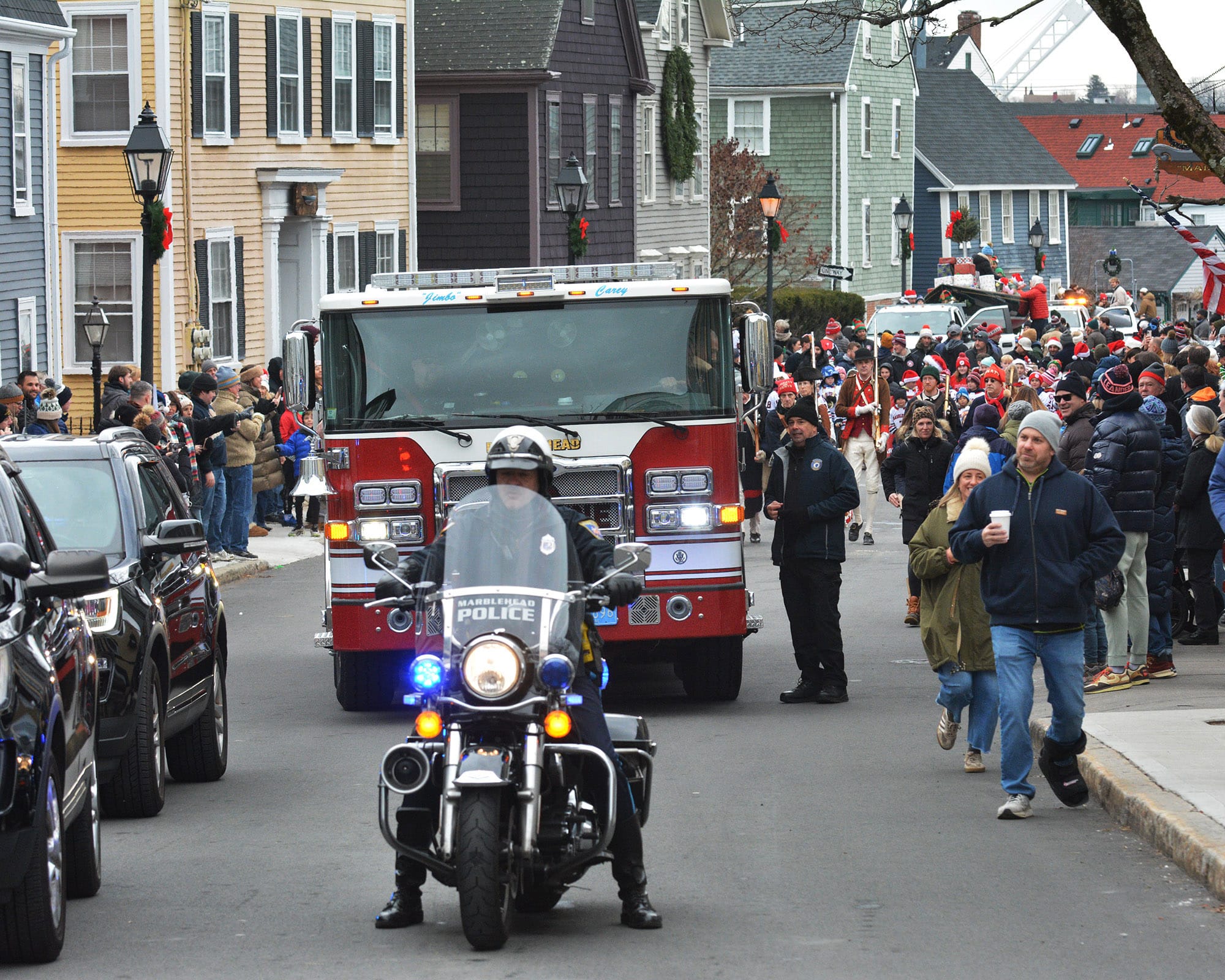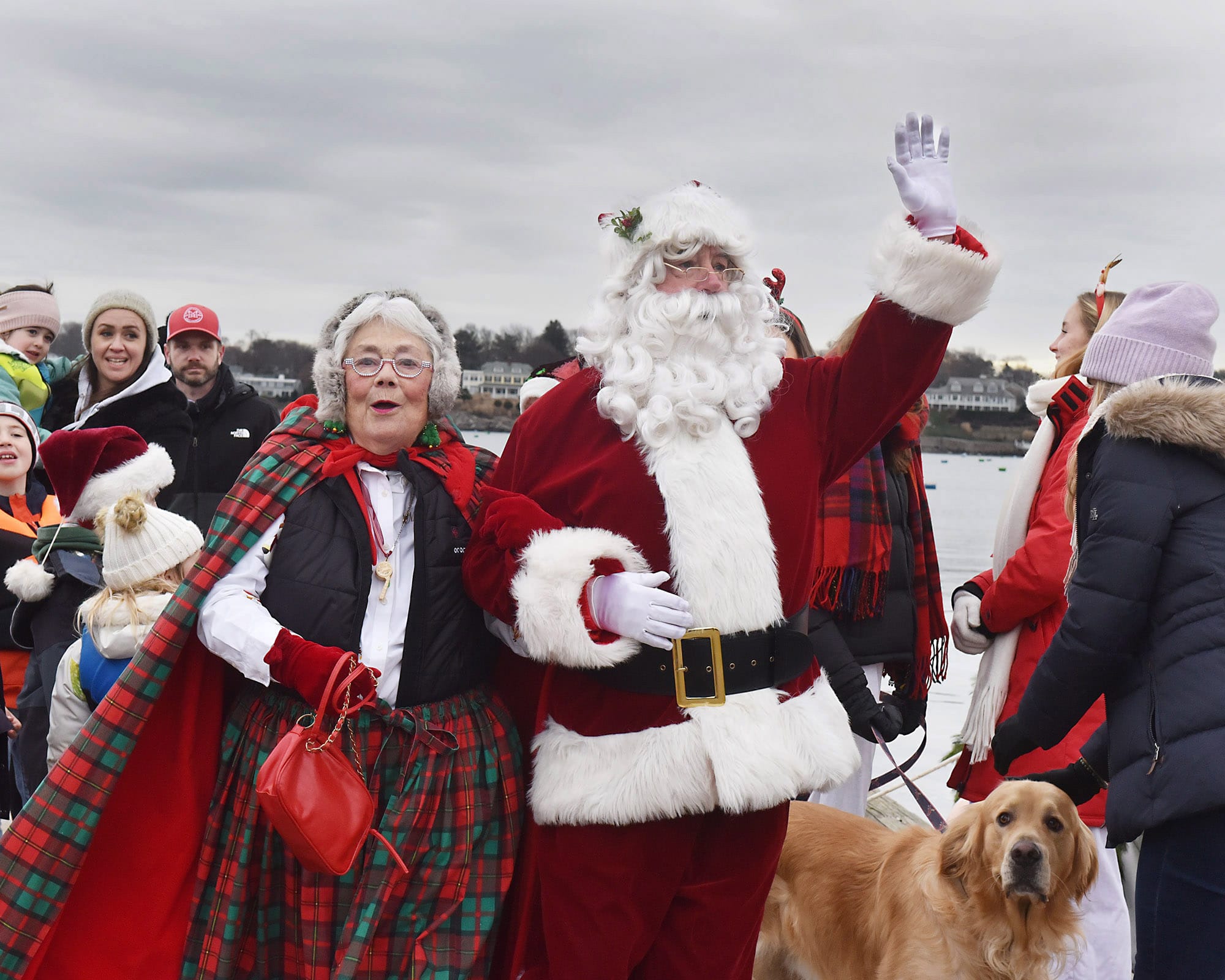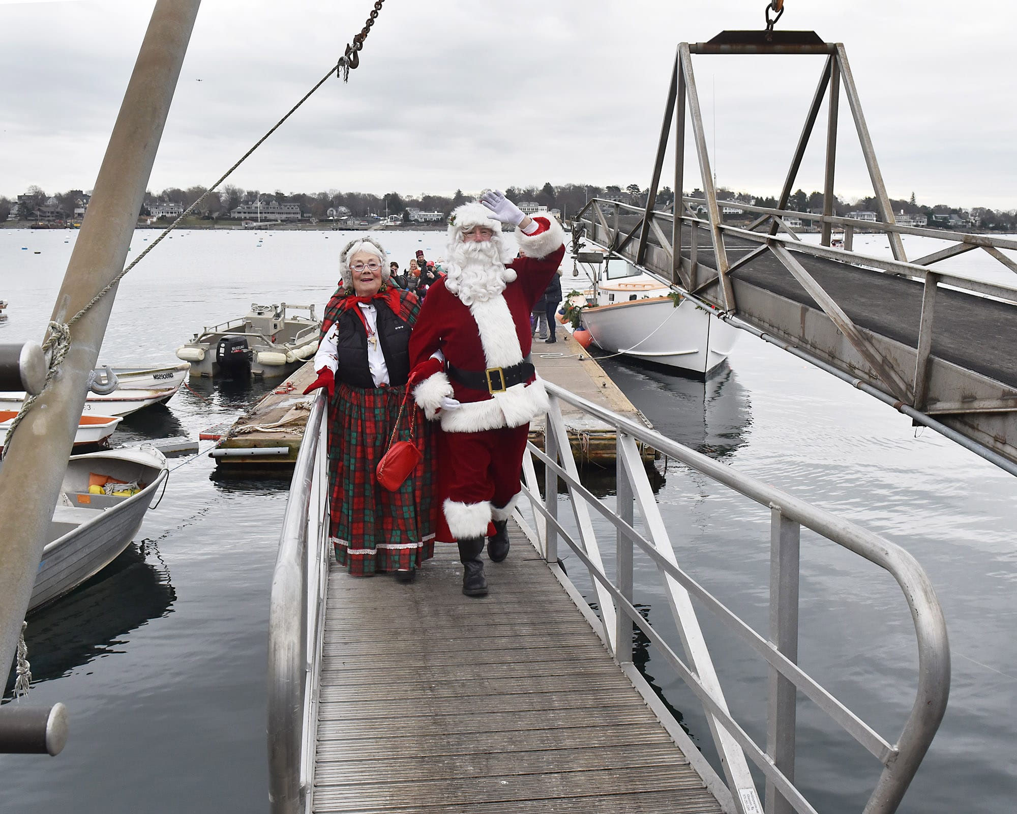 Santa Claus and Mrs. Claus greet the waiting crowd at the landing. Santa arrived by lobster boat, a signature tradition of the Marblehead Christmas Walk, waving to families gathered along the waterfront.Santa’s lobster boat, trimmed with greens and bows, makes its way toward State Street Landing as spectators gather along the waterfront. INDEPENDENT PHOTOS / PAULA MULLERAA bundled toddler peeks out from a stroller during the Christmas Walk festivities.Santa and Mrs. Claus wave from the bow as children crowd forward for a view during the Christmas Walk’s traditional harbor arrival. Marblehead police officers stand along the parade route as crowds move toward the waterfront and downtown.Young participants line a holiday-themed parade float, waving to spectators along the route.A Marblehead fire engine and police motorcycle lead the way through the crowded streets of Old Town. The parade drew dense crowds who packed the sidewalks to watch the marchers, floats, and first responders pass by.A group of children sits curbside, bundled in heavy winter coats and hats. The young spectators have claimed front-row seats to watch the holiday parade pass by.Crowds pack the narrow streets of Old Town near the iconic "Maddies" Sail Loft sign. Members of Glover’s Marblehead Regiment march in period uniform on the left, joining a procession that includes festive floats like a boat piled high with holiday gifts.A couple carefully adjusts a holiday wreath on a large grey float or display, adding the finishing touches before the celebrations get fully underway.Spectators line the railing outside "The Landing" restaurant, bundled in winter gear as they watch the festivities unfold from the deck.A member of Glover’s Marblehead Regiment holds a musket topped with a festive sprig of greenery. The reenactor is dressed in the regiment's traditional blue coat with red trim and a grey knit cap.Santa and Mrs. Claus wave to the crowd as they make their way up the metal ramp from the dock, marking their official arrival in Marblehead.Three children, including a baby in a blue hat, gather for a group photo with Santa and Mrs. Claus.Santa and Mrs. Claus walk along the waterfront, with Santa waving to the onlookers, accompanied by a golden dog.Families pack the dock at State Street Landing on Saturday morning as Santa arrives by lobster boat during the 54th annual Marblehead Christmas Walk.A festive fleet of cars joins the procession, led by a bright red Lamborghini decked out with string lights and a holiday wreath on the hood. The sports car cruises down the street, adding a flash of modern horsepower to the traditional lineup.The Marblehead Pride Committee marches through town holding a colorful banner that wishes the crowd "Happy Holidays." The sign features inclusive festive symbols, including a menorah and a heart displaying the Progress Pride flag colors.