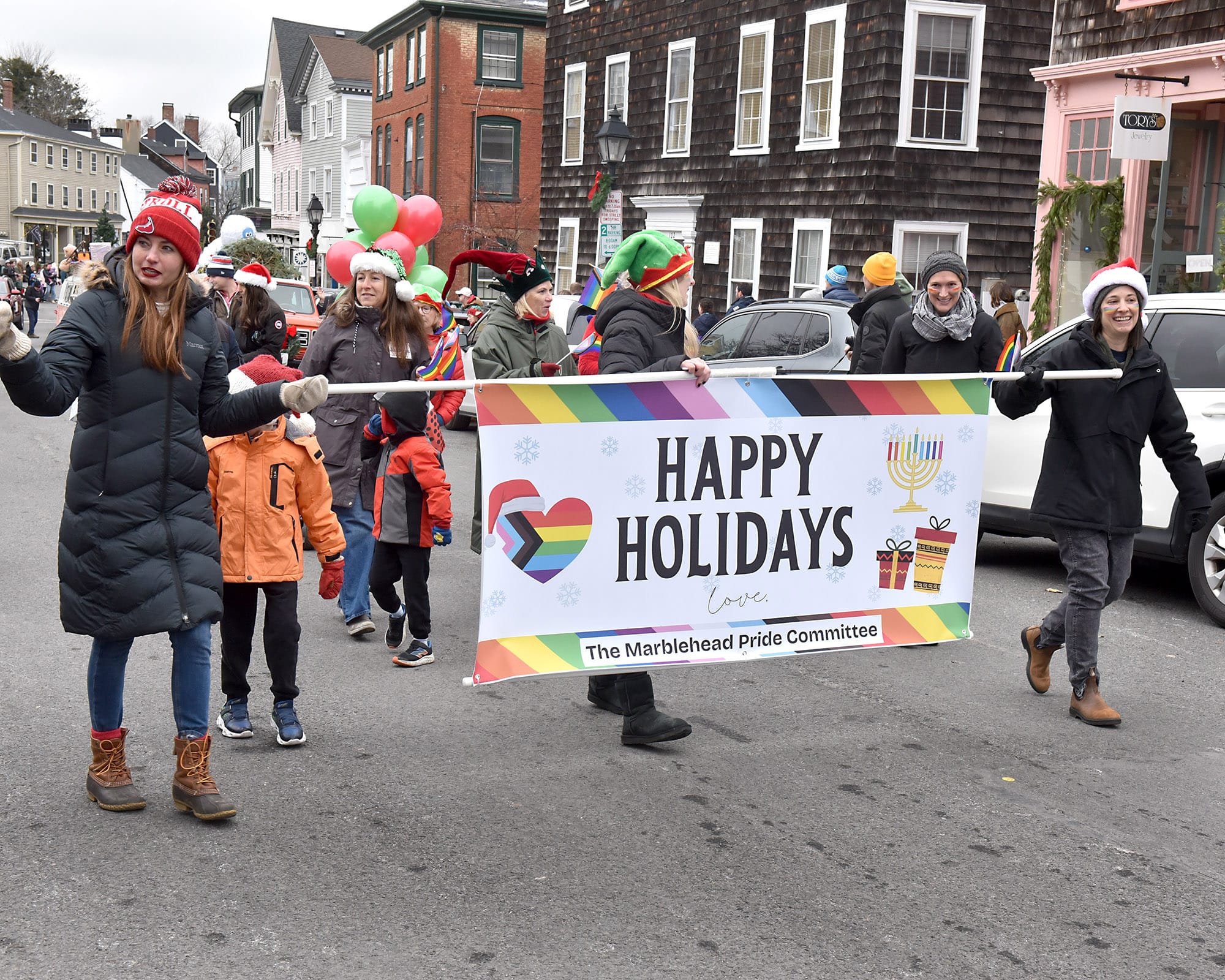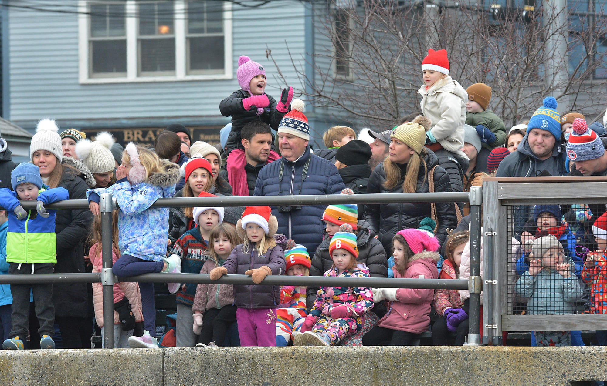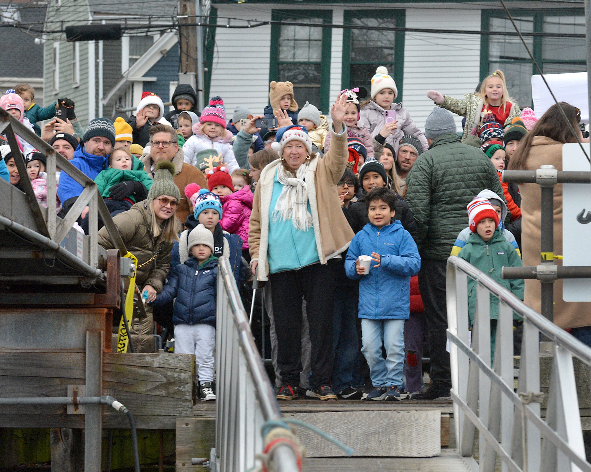 Santa Claus and Mrs. Claus greet the waiting crowd at the landing. Santa arrived by lobster boat, a signature tradition of the Marblehead Christmas Walk, waving to families gathered along the waterfront.Santa’s lobster boat, trimmed with greens and bows, makes its way toward State Street Landing as spectators gather along the waterfront. INDEPENDENT PHOTOS / PAULA MULLERAA bundled toddler peeks out from a stroller during the Christmas Walk festivities.Santa and Mrs. Claus wave from the bow as children crowd forward for a view during the Christmas Walk’s traditional harbor arrival. Marblehead police officers stand along the parade route as crowds move toward the waterfront and downtown.Young participants line a holiday-themed parade float, waving to spectators along the route.A Marblehead fire engine and police motorcycle lead the way through the crowded streets of Old Town. The parade drew dense crowds who packed the sidewalks to watch the marchers, floats, and first responders pass by.A group of children sits curbside, bundled in heavy winter coats and hats. The young spectators have claimed front-row seats to watch the holiday parade pass by.Crowds pack the narrow streets of Old Town near the iconic "Maddies" Sail Loft sign. Members of Glover’s Marblehead Regiment march in period uniform on the left, joining a procession that includes festive floats like a boat piled high with holiday gifts.A couple carefully adjusts a holiday wreath on a large grey float or display, adding the finishing touches before the celebrations get fully underway.Spectators line the railing outside "The Landing" restaurant, bundled in winter gear as they watch the festivities unfold from the deck.A member of Glover’s Marblehead Regiment holds a musket topped with a festive sprig of greenery. The reenactor is dressed in the regiment's traditional blue coat with red trim and a grey knit cap.Santa and Mrs. Claus wave to the crowd as they make their way up the metal ramp from the dock, marking their official arrival in Marblehead.Three children, including a baby in a blue hat, gather for a group photo with Santa and Mrs. Claus.Santa and Mrs. Claus walk along the waterfront, with Santa waving to the onlookers, accompanied by a golden dog.Families pack the dock at State Street Landing on Saturday morning as Santa arrives by lobster boat during the 54th annual Marblehead Christmas Walk.A festive fleet of cars joins the procession, led by a bright red Lamborghini decked out with string lights and a holiday wreath on the hood. The sports car cruises down the street, adding a flash of modern horsepower to the traditional lineup.The Marblehead Pride Committee marches through town holding a colorful banner that wishes the crowd "Happy Holidays." The sign features inclusive festive symbols, including a menorah and a heart displaying the Progress Pride flag colors.
