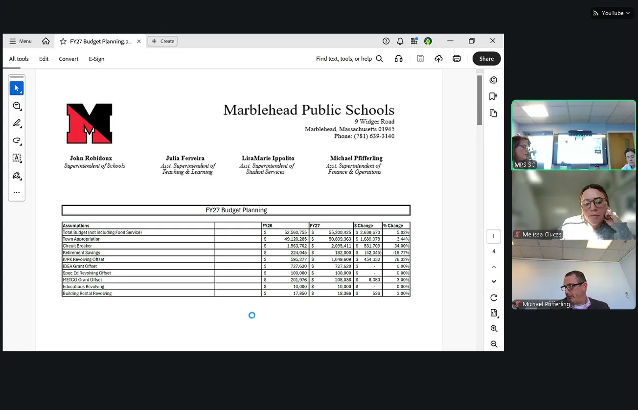 The Marblehead School Committee Budget Subcommittee on Jan. 29 reviewed a fiscal year 2027 budget proposal that would eliminate five teaching positions and one maintenance worker if the district receives no additional revenue beyond level funding from the town.