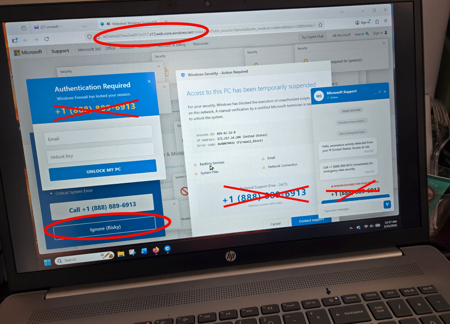 Second, notice the wording “Ignore (Risky).” That phrasing is intentional. It’s designed to increase your anxiety, making you feel like ignoring the message could make things worse, especially when you’re already overwhelmed by multiple urgent pop-ups telling you to call “technical support.”