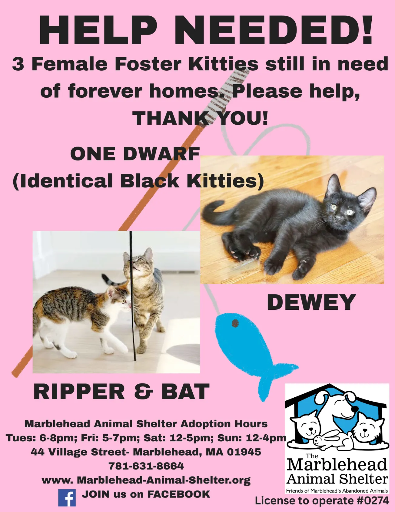 Three female foster kittens named Dewey, Ripper and Bat are still seeking permanent homes through the Marblehead Animal Shelter.