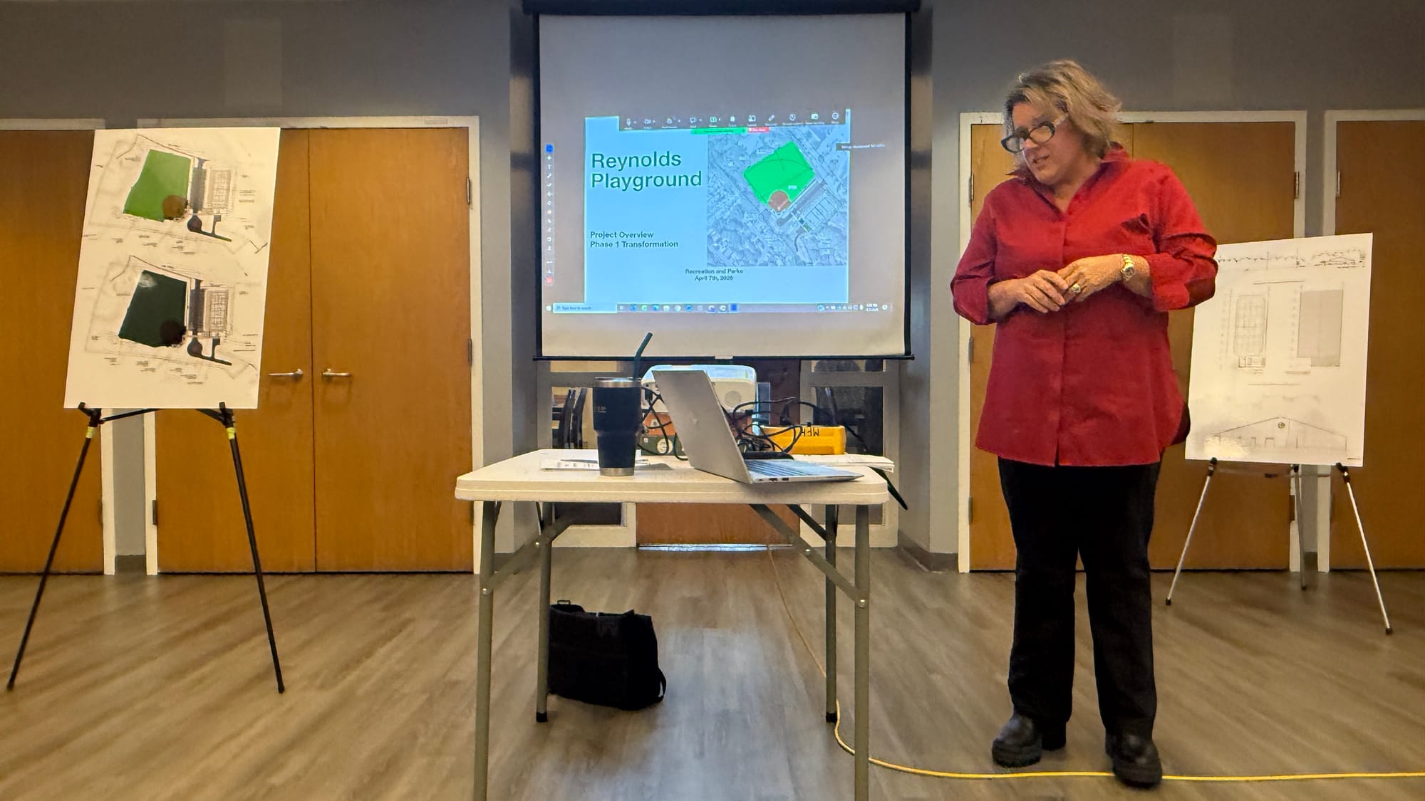 Commissioner Shelly Curran Bedrossian led the public meeting, presenting the project as one that would rely on rental fees to cover operating costs and future equipment replacement rather than the town’s general fund. The plan centers on Reynolds Playground and is built around a bequest from Larz Anderson granted in 2018, originally valued at $2.2 million and now worth about $3.3 million after an additional $800,000 was added.