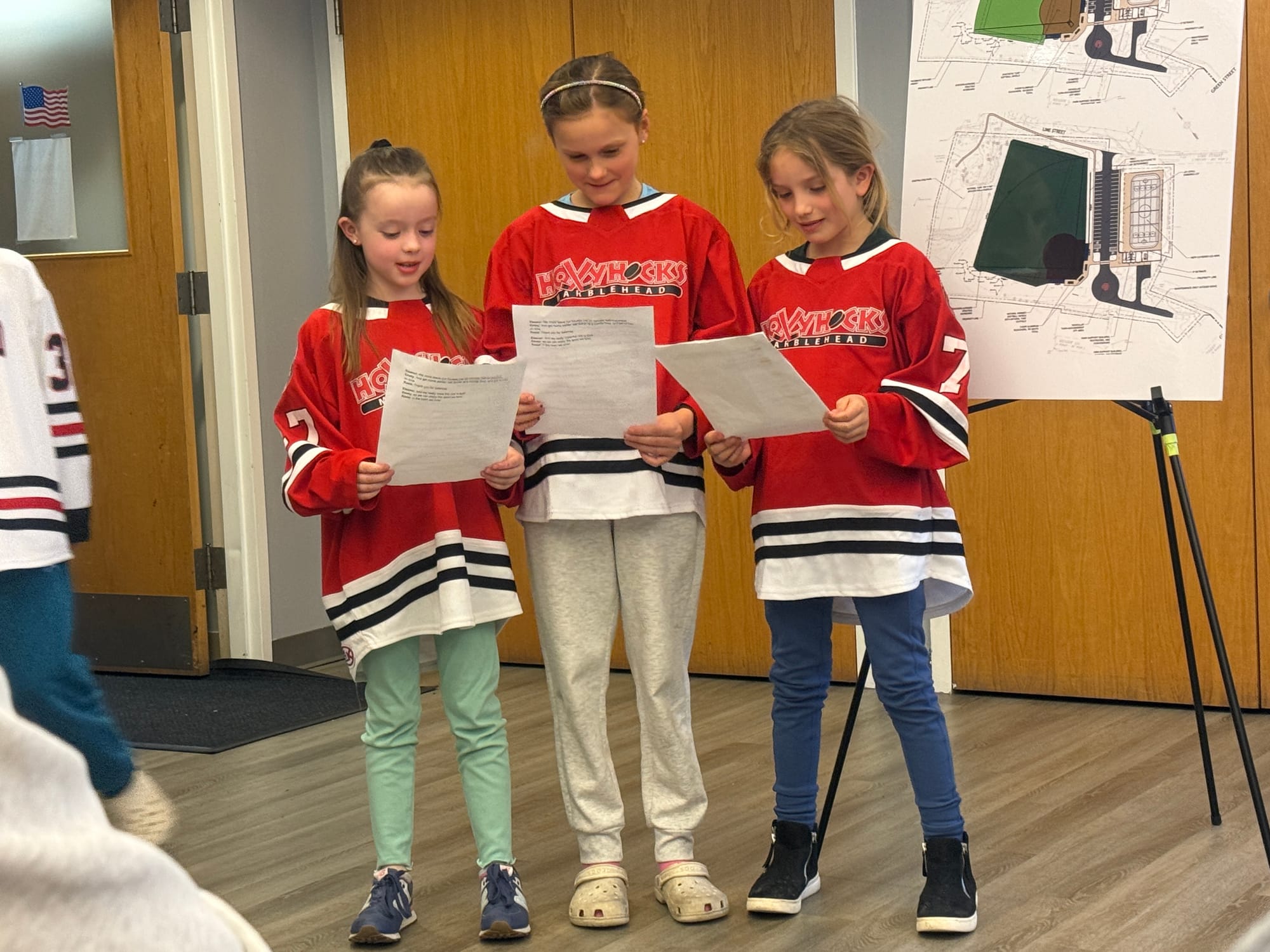 Four Mite players — Eleanor Ries, Emmy Fox, Rosie Inglis and Mickey Garnitz — read a joint statement describing practices in Lynn and Revere that force them to leave Marblehead by 4:15 p.m. and return home after 7:30 p.m.